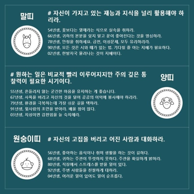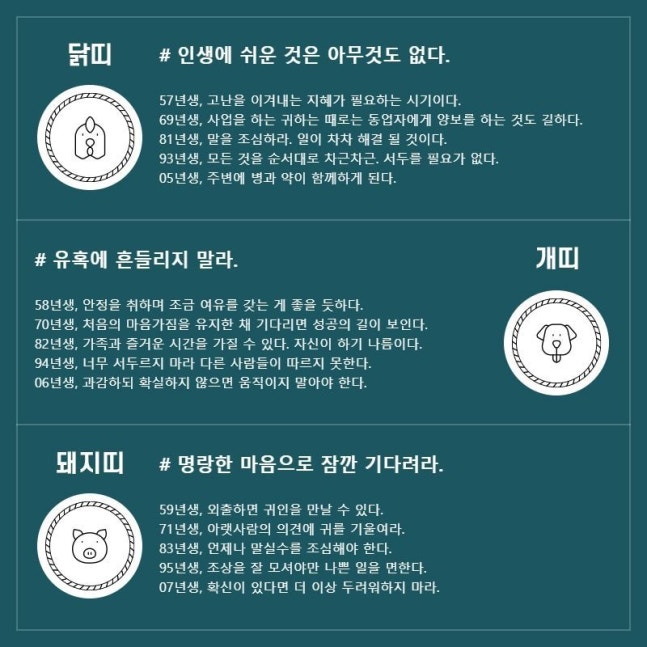 개띠 # 유혹에 흔들리지 말라. 58년생, 안정을 취하며 조금 여유를 갖는 게 좋을 듯하다.