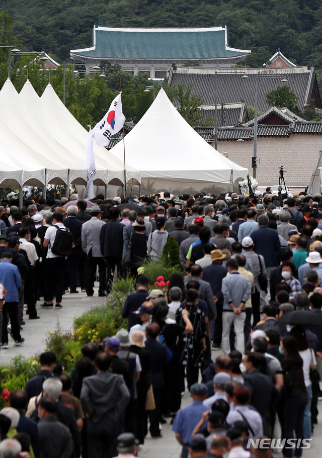 [서울=뉴시스]추상철 기자 =고 백선엽 예비역육군대장의 영결식을 하루 앞둔 14일 오후 서울 종로구 광화문광장에 마련된 시민분향소 뒤로 청와대가 보이고 있다. 2020.07.14.