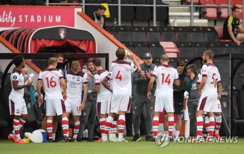 Southampton's manager Ralph Hasenhuttl (C) speaks to his players during the English Premier League match between AFC Bournemouth and Southampton in Bournemouth, Britain, 19 July 2020. EPA/Mike Hewitt/NMC/Pool EDITORIAL USE ONLY. No use with unauthorized audio, video, data, fixture lists, club/league logos or 'live' services. Online in-match use limited to 120 images, no video emulation. No use in betting, games or single club/league/player publications.