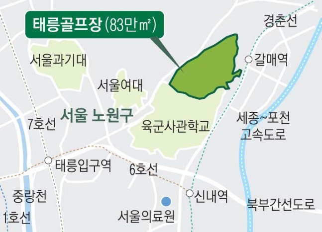 군 시설인 태릉골프장은 박정희 전 대통령의 지시로 1966년 11월 9홀 규모로 개장한 뒤 1970년 10월 정규 18홀로 확장했다. 부지 면적은 약 82만㎡에 달하며 육군사관학교와 인근의 태릉선수촌 터까지 합치면 250만㎡까지 늘어난다. 서울의 최근 대규모 개발지인 강서구 마곡지구(366만㎡)의 약 70%에 해당하는 면적이다. 지하철 6호선 화랑대역과 봉화산역, 경춘선 갈매역 등이 가까워 접근성도 좋다. 주소지를 서울로 하는 유일한 골프장으로 현재 군인들의 체력 단련 용도로 쓰이고 있다.
