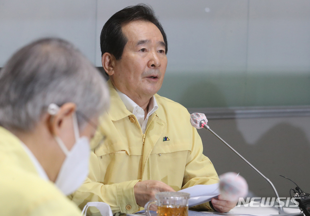 [서울=뉴시스]김명원 기자 = 정세균 국무총리가 12일 오전 서울 종로구 정부서울청사에서 열린 코로나19 대응 중앙재난안전대책본부(중대본) 회의에 참석해 발언하고 있다. 2020.08.12.