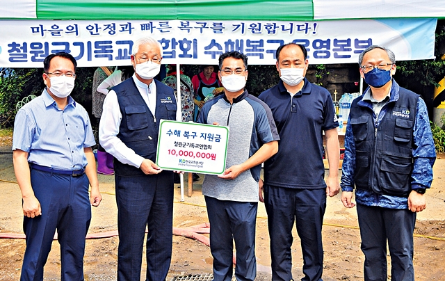 정성진 한국교회봉사단 이사장(왼쪽 두 번째)이 13일 강원도 동송읍 이길리 이길교회를 방문해 김진행 철원군기독교연합회장(왼쪽 세 번째)에게 긴급구호금 1000만원을 전달하고 있다. 철원=강민석 선임기자철원군기독교연합회(회장 김진행 목사)도 이길교회(권영일 목사) 마당에 수해복구 운영본부를 차렸다. 이 교회도 2m 높이까지 물이 차올라 교회 집기 대부분을 폐기했다. 권영일 목사는 “나흘 동안 물 폭탄 수준의 비가 퍼부었고 결국 제방이 터지면서 온 마을이 물에 잠겼다”면서 “곧 은퇴하지만 후임 목사님이 사역하시는 데 부족함이 없도록 교회를 온전히 복구하고 싶다”고 말했다. 이어 “전국에서 봉사자들이 오고 계시고 지역 교회 목사님들도 구슬땀을 흘리며 복구를 돕고 있다”면서 “북한과 접경 지역에서 계속 복음을 전할 수 있도록 많은 기도와 관심을 가져달라”고 호소했다.