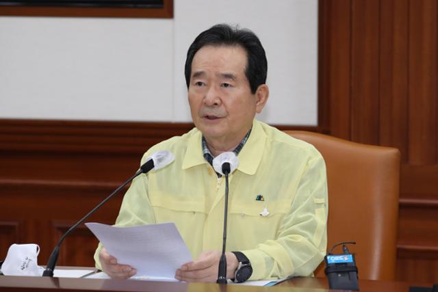 정세균 국무총리가 15일 서울 종로구 정부서울청사에서 열린 긴급 중앙재난안전대책본부(중대본) 회의에서 발언하고 있다. 정 총리는 이날 중대본 회의에서 서울시와 경기도에서 사회적 거리두기를 2단계로 높이고자 한다고 말했다. 연합뉴스정세균 국무총리는 15일 "서울시와 경기도에서 사회적 거리두기를 2단계로 높이고자 한다"고 밝혔다.