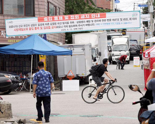 코로나19 집단감염이 발생한 서울 성북구 사랑제일교회로 가는 길이 통제돼 있다. 17일 낮 12시 현재 이 교회 누적 확진자는 319명이다. 연합뉴스서울과 경기도 등 수도권을 중심으로 교회발 신종 코로나바이러스감염증(코로나19) 확진자가 늘고 있다. 교계 및 방역 전문가들은 대규모 감염을 막기 위해 교회가 정부 방역지침보다 더 강력한 방역에 나서야 한다고 조언했다.