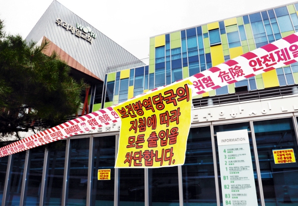 코로나19 확진자가 나온 경기도 용인 우리제일교회에 출입 통제를 알리는 안내문이 붙어있는 모습. 연합뉴스경기도 용인 우리제일교회도 16일 교인과 접촉자 21명이 양성 판정을 받아 누적 확진자가 총 126명이 됐다. 서울 양천구 되새김교회도 3명이 추가돼 7명이 됐다. 이달 초 경기도 고양 반석교회와 기쁨153교회에서도 집단감염이 발생한 뒤 연쇄감염으로 이어졌다