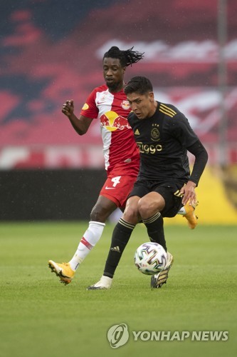 Red Bull Salzburg's Majeed Ashimeru (L) in action against Ajax Amsterdam's Edson Alvarez (R) during a pre-season friendly soccer match between FC Red Bull Salzburg and Ajax Amsterdam in Salzburg, Austria, 22 August 2020. EPA/ANDREAS SCHAAD