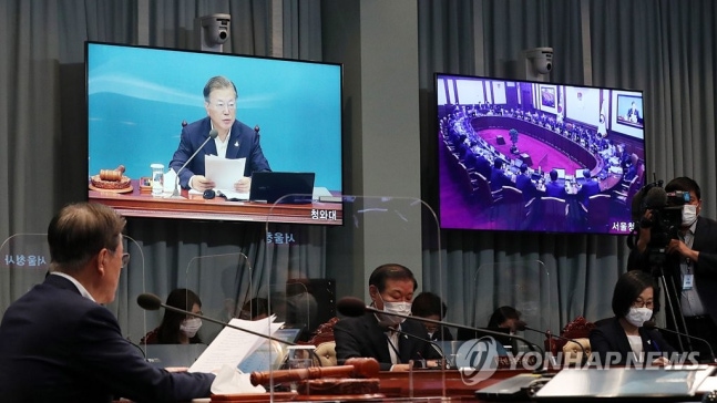 (서울=연합뉴스) 김주성 기자 = 문재인 대통령이 25일 오전 청와대 여민관에서 영상 국무회의를 주재하고 있다.