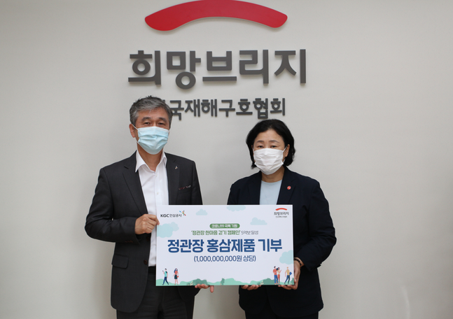 24일 정관장 홍삼제품 기부식에서 김호겸 KGC인삼공사 대외협력실장(왼쪽)과 김정희 희망브릿지 전국재해구호협회 사무총장이 기념촬영을 하고있다.ⓒKGC인삼공사KGC인삼공사는 10억원 상당의 정관장 홍삼제품을 희망브리지 전국재해구호협회를 통해 코로나19 방역 일선의 의료진 및 관계 공무원에게 전달했다고 25일 밝혔다.