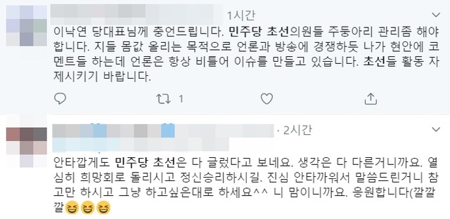 민주당 지지층으로 추정되는 누리꾼들은 이 신임 대표에 소속 의원들의 메시지 관리를 당부하고 있다. /트위터 갈무리