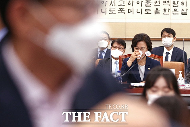 지난 1일 국회 법제사법위원회 전체회의에 참석한 추미애 법무부 장관이 본인 아들의 병역 문제를 놓고 여야가 언쟁을 벌이는 사이 물을 마시는 모습. /배정한 기자