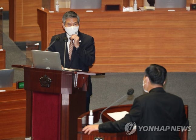 정 장관은 전날 하태경 의원이 2주일 병가를 신청했지만 실제 치료받은 3일만 병가로 처리된 다른 병사의 사례를 언급하자 "그 친구처럼 하는 게 맞다"고 했다가 이후 추 장관 아들의 휴가처리가 잘못됐다고 인정한 것은 아니라고 해명했다.