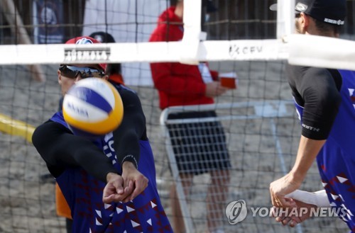 Adrian Gavira Collado of Spain in action during the men's second round match with compatriot Pablo Herrera Allepuz against Michal Bryl and Mikolaj Miszczuk of Poland at the 2020 CEV Beach Volleyball European Championships in Jurmala, Latvia, 19 September 2020. EPA/TOMS KALNINS