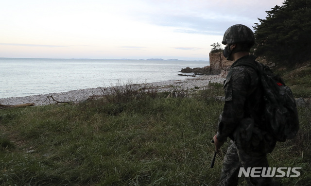 [연평도=뉴시스] 최진석 기자 = 문재인 대통령이 군은 경계태세를 더욱 강화하여 국민의 생명과 안전을 보호하기 위한 만반의 태세 시지를 내린 이튿날인 25일 오전 인천시 옹진군 연평도에서 해병대 장병들이 해안경계를 하고 있다. 해안경계 장병들 뒤로 보이는 해안은 실종 공무원이 관측, 피격된 북한 황해남도 옹진군 등산곶 해안. 2020.09.25.