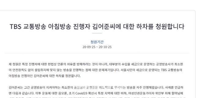 25일 청와대 국민청원 게시판에는 ‘tbs 교통방송 아침방송 진행자 김어준씨에 대한 하차를 청원합니다’라는 제목의 글이 올라왔다.