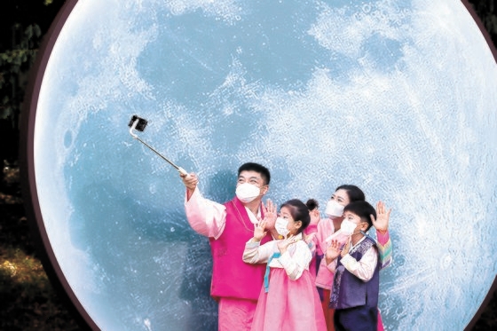 영상통화로 안부 인사, 비대면 한가위 추석 연휴를 하루 앞둔 29일 한복을 차려입고 대구 이월드를 찾은 일가족이 대형 보름달 사진 앞에서 고향 어르신들과 영상통화를 하고 있다. 신종 코로나바이러스 감염증(코로나19) 확산을 우려한 정부가 이동 자제 요청을 하고, 많은 어르신이 자손들의 귀향을 만류하면서 이번 추석은 초유의 ‘비대면 추석’이 될 가능성이 커졌다. 이에 따라 통화로 명절 인사를 하는 가족이 늘 것으로 보인다. [뉴스1]