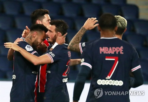 Paris Saint-Germain's Neymar (L) celebrates with teammates after scoring the 3-0 lead during the French Ligue 1 soccer match between Paris Saint-Germain (PSG) and Angers SCO at the Parc des Princes stadium in Paris, France, 02 October 2020. EPA/CHRISTOPHE PETIT TESSON