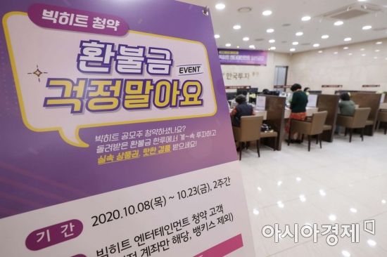 그룹 방탄소년단의 소속사 빅히트엔터테인먼트의 일반 공모주 청약 마지막 날인 6일 서울 영등포구 한국투자증권 본사 영업부에서 개인투자자들이 청약 상담을 받고 있다. 이날 일반 공모청약이 끝나면 빅히트는 오는 15일 코스피 시장에 상장할 예정이다. /문호남 기자 munonam@