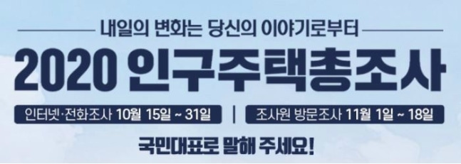 2020 인구주택총조사는 행정자료를 활용한 등록센서스 방식의 전수조사와 국민 20%를 대상으로 한 표본조사로 나눠 실시한다.