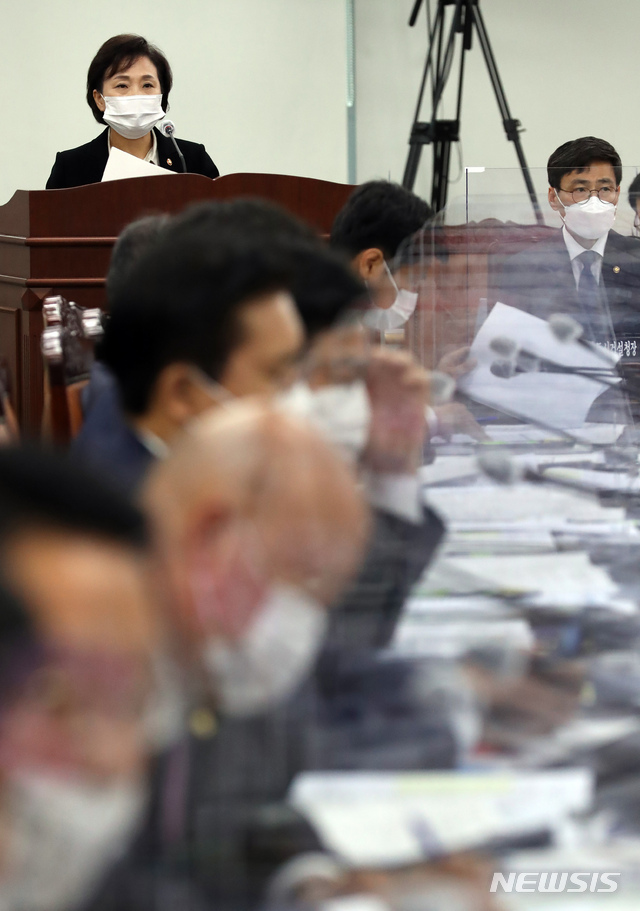 [세종=뉴시스]강종민 기자 = 김현미 국토교통부 장관이 16일 정부세종청사에서 열린 국회 국토교통위원회의 국토부에 대한 국정감사에서 업무보고를 하고 있다. 2020.10.16.