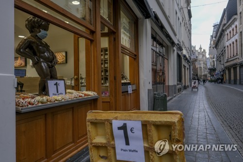 A Waffel shop makes sales at only 1 euro in anticipation of a lockdown, due to covid-19 situation, customers mainly tourists completely disappeared, in Brussels, Belgium, 28 October 2020. Belgium is witnessing a rise in coronavirus infections prompting the government to impose new restrictions that came into effect on 19 October including the closure of bars and restaurants for four weeks. The government announced new measure will come at the end of the week and people are scared a new lockdown will be announced. EPA/OLIVIER HOSLET