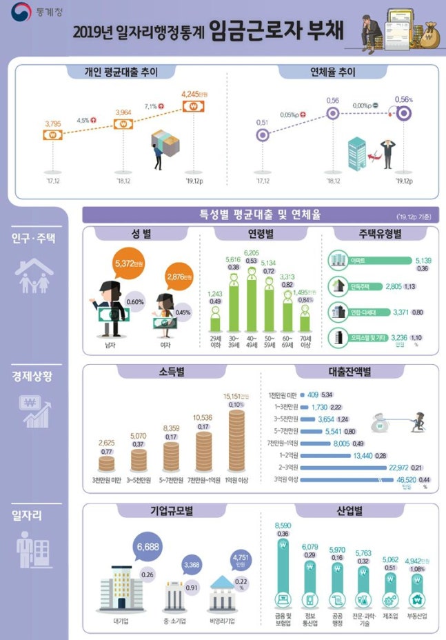 한편, 지난해 전체 임금근로자 평균 개인대출액은 4245만 원으로 2018년 3964만 원보다 7.1%(281만 원) 늘었다.