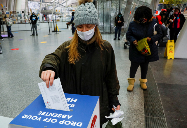 지난달 29일(현지시간) 미국 뉴욕시의 브루클린 박물관에 마련된 투표함에 한 여성 유권자가 투표용지를 넣고 있다./로이터 연합뉴스[서울경제] 마스크를 비롯한 보호 장구도 없이 신종 코로나바이러스 감염증(코로나19) 환자를 받는 의료진과 밀려드는 환자들로 아비규환이 되어버린 병원, 하루하루 냉동 트레일러에 쌓여가는 시신들. 모두 세계 최강국인 미국에서 벌어지고 있는 일들이다. 코로나19가 드러낸 것은 부실한 미국 의료 시스템만이 아니다. 심각한 기저질환을 앓고 있던 미국 경제의 민낯도 여실히 들춰냈다. 대량 실직으로 인해 빈곤층으로 전락한 시민들이 실업수당을 타기 위해 몰려들고, 무료 급식 줄에 늘어선 모습은 주식시장과 부동산 붐 뒤에 가려진 미국 경제의 어두운 그림자다.