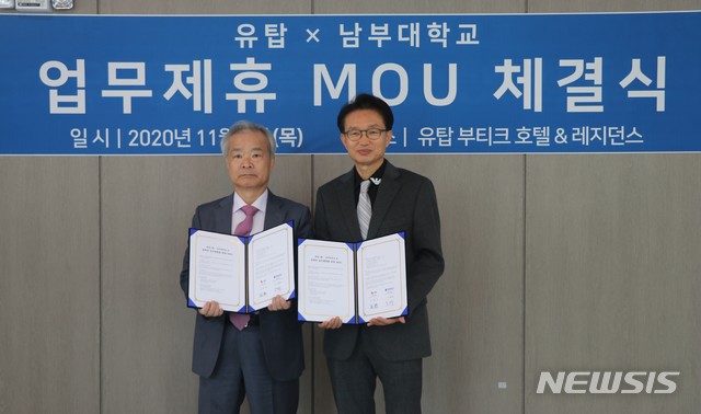 유탑그룹과 남부대는 이번 협약에 따라 대학생들의 취업 장려를 위한 직업 교육과 인재육성 프로그램 기획, 제휴 마케팅,상호 복지 지원, 국제수영대회 진행 시 숙박 연계 및 객실 할인 등을 추진키로 했다.