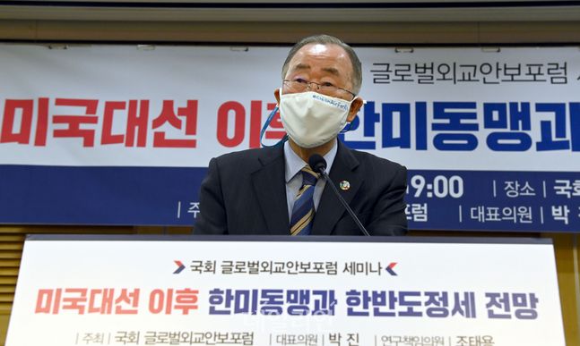 ⓒ데일리안 박항구 기자12일 오전 국회 의원회관에서 국회 글로벌외교안보포럼이 주최한 ‘미국 대선 이후 한미동맹과 한반도 정세 전망 포럼’에서 반기문 전 유엔사무총장이 기조 연설을 하고 있다.