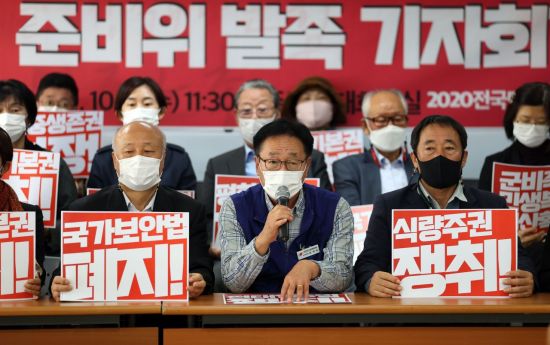 지난달 14일 서울 중구 전국민주노동조합총연맹 대회의실에서 열린 2020 전국민중대회 준비위 발족 기자회견에서 김재하 민주노총 비상대책위원장(가운데)이 발언하고 있다. [이미지출처=연합뉴스]