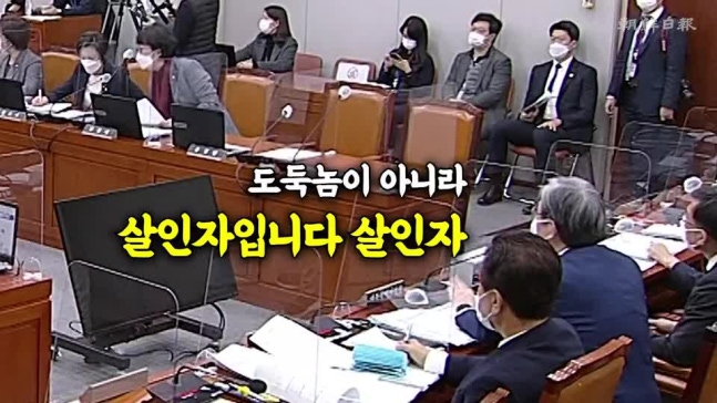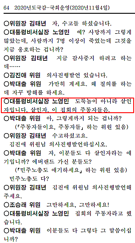 두 사람이 언쟁을 벌이자 김태년 위원장이 “비서실장님, 그렇게 반응을 보이면 어떻게 해요? 발끈하실 일은 아닌 것 같다"고 중재에 나섰다. 하지만 노 실장은 “거기 참석한 국민들한테 한 말이 아니었지 않느냐”며 물러서지 않았다. 집회 참석자가 아니라 주동자에게 살인자라고 했다는 의미로 해석됐다.