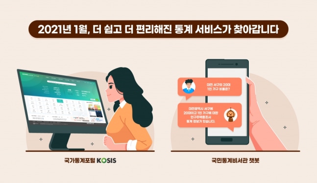 최근 개발 중인 ‘국민통계비서관’ 챗봇 서비스는 마우스 클릭도 필요 없다. 채팅창에 궁금한 통계 정보를 말하면 10초 안에 원하는 정보를 추천하고 안내해준다. 기계학습을 하는 챗봇서비스는 지속적으로 이용자와 대화 또는 학습을 통해 시간이 지날수록 보다 질 좋은 통계정보를 제공할 것이다. 이 외에도 통계청은 다양한 시각화 콘텐츠로 국민 누구나 이해하기 쉽고 이용하기 편한 형태로 통계 데이터를 제공하고 있다.