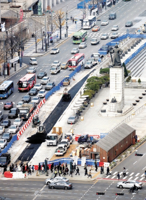 내년 10월 완공을 목표로 시작된 광화문광장 공사가 17일 진행되고 있다. 서울시는 내년 2월까지 광장 동쪽 도로를 확장한 뒤 서쪽으로 광장을 넓혀 공원을 조성할 계획이다. [뉴시스] 광화문광장이 또다시 논란에 휩싸였다. 건축가 승효상씨의 아이디어에서 출발해 ‘승효상 안’으로 불리는 광장 재구조화 사업에 대해 서울시가 “예정대로 추진한다”며 16일 착공에 들어가면서다. 서울시 계획대로라면 세종문화회관이 있는 광장 서쪽은 차도가 없어지고 공원처럼 조성된다. 반대편인 주한 미국대사관 쪽에는 7~9차로로 확장한 차도가 생긴다. 공사는 내년 10월 완료될 계획이다.