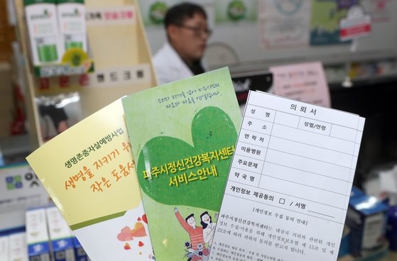 경기도 파주시 정신건강복지센터에서 관내 약국에 비치한 자살 예방 관련 자료. [중앙포토] 경기도 파주시에 사는 70대 A씨가 올해 초 동네 약국에서 수면제를 주문했다. 오랫동안 치매 남편 수발을 들며 버텨온 A씨였다. 그 집 사정을 잘 아는 약사가 금방 눈치 챘다. 약사가 A씨의 넋두리를 들어주며 공감을 표하고 위로했다. 급한 불을 끈 뒤 정신건강복지센터 전문 상담으로 연결했다.