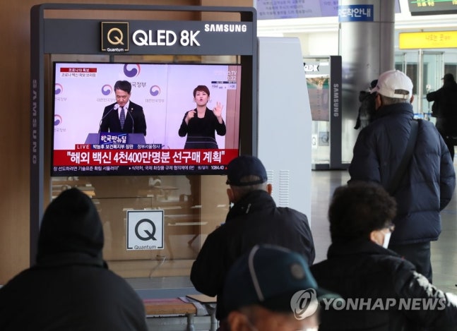 (서울=연합뉴스) 임헌정 기자 = 8일 서울 중구 서울역에서 시민들이 정부의 코로나19 백신 확보 브리핑을 TV화면으로 지켜보고 있다. 2020.12.8