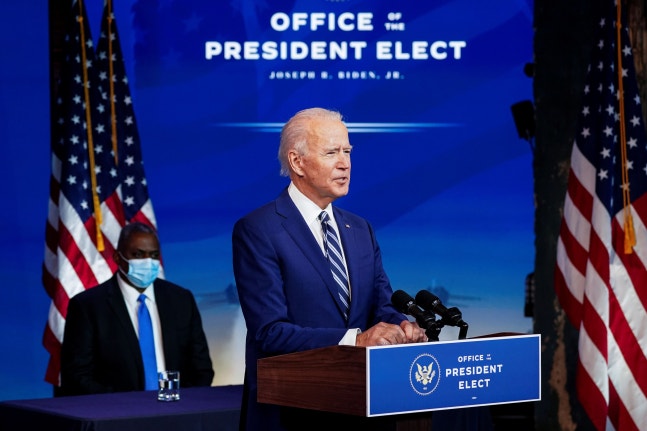 조 바이든 미 대통령 당선인이 9일(현지시각) 델라웨어주 윌밍턴의 인수위원회에서 로이드 오스틴(왼쪽) 전 중부사령관을 자신이 이끌 차기 행정부의 첫 국방부 장관으로 지명해 발표하고 있다. 오스틴은 인준 절차를 통과하면 미국 최초의 흑인 국방장관이 된다. /로이터 연합뉴스