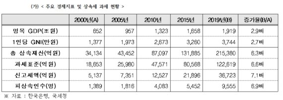 지난해 상속세 신고세액은 3조6723억원으로 2000년 5137억원 대비 7.1배 증가했다. 그러나 19년간 국내 경제발전으로 소득 수준이 높아지는 동안에도 상속세와 관련해 과표구간, 세율, 공제 규모 등은 거의 변하지 않았다.