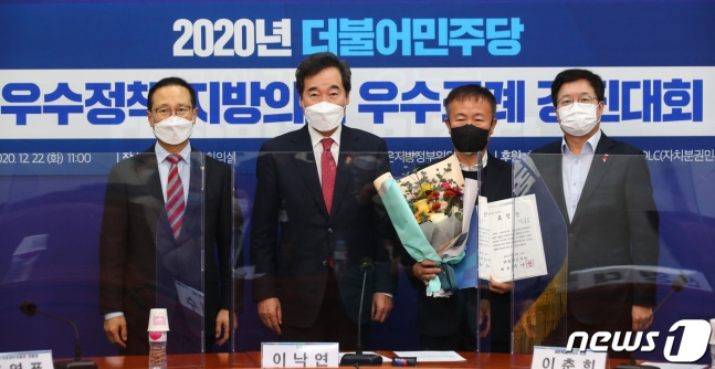 (서울=뉴스1) 박세연 기자 = 이낙연 더불어민주당 대표가 22일 오전 국회에서 열린 더불어민주당 2020년 지방정부 우수정책-지방의회 우수조례 시상식에서 이재수 춘천시장에게 상장을 수여한 뒤 기념촬영을 하고 있다. 왼쪽부터 홍영표 참좋은지방정부위원장, 이 대표, 이재수 춘천시장, 염태영 최고위원. 2020.12.22/뉴스1