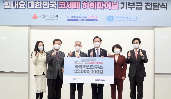 산업통상자원부 제공 [파이낸셜뉴스] 성윤모 산업통상자원부 장관은 23일 서울 대한상공회의소에서 2020 코리아세일페스타(11월 1~15일) 나눔·기부 행사인 하이파이브 캠페인 수익금 전달식을 가졌다. 산업부가 코리아세일페스타 추진위원회와 함께 올해 처음 추진한 하이파이브 캠페인은 소비자와 기업인이 함께 격려·응원하는 희망의 메시지를 담아 기부하는 행사다. 네이버 '해피빈'에서 진행된 기획전에서 2억1400만원 상당의 에코벡 등 캠페인 상품이 판매됐고, 4400만원의 수익금(기부금)이 적립됐다. 이날 성 장관은 정부를 대표해 사회복지공동모금회와 백신연구소에 수익금을 전달했다. 성 장관은 "이번 캠페인이 더 큰 나눔으로 이어지는 계기가 되길 바란다"고 했다. 성 장관(오른쪽 세번째)이 관계자들과 기념촬영을 하고 있다.