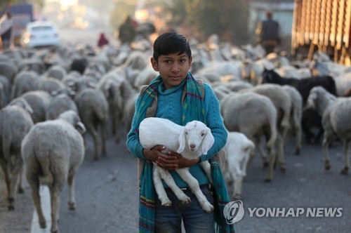 epaselect epa08904519 A young shepherd with a herd of sheep as they move during their annual migration at Bhota near Hamirpur, in Himachal Pradesh, India, 26 December 2020. Migration is an annual practice among the shepherds and they move from mountains area to warm and lower areas as winter approaches. EPA/SANJAY BAID