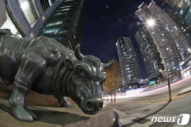 (서울=뉴스1) 송원영 기자 = 2021년 신축년(辛丑年) '소의 해'를 앞두고 서울 영등포구 여의도 금융투자협회 앞 황소상 뒤로 영겁의 시간이 지나가듯 차량 불빛 행렬이 이어지고 있다.