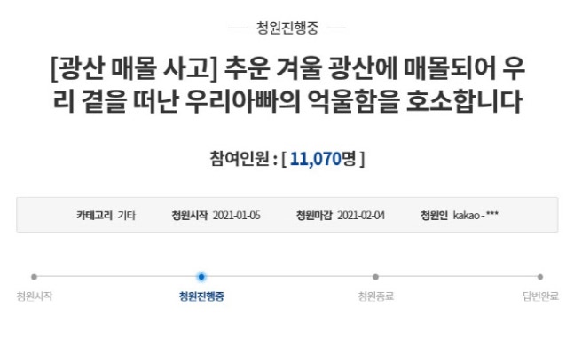 지난 5일 청와대 국민청원 게시판에는 ‘추운 겨울 광산에 매몰되어 우리 곁을 떠난 아빠의 억울함을 호소합니다’라는 제목으로 청원이 게시됐다.