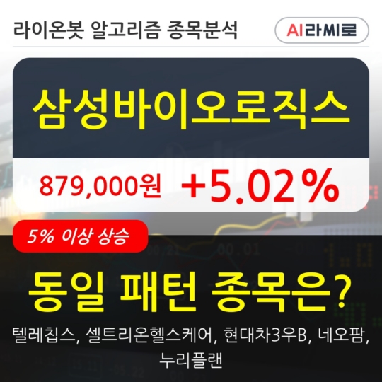이 시각 거래소에서 삼성바이오로직스 이외에도 텔레칩스(5.14%), 셀트리온헬스케어(6.14%), 현대차3우B(16.92%), 네오팜(5.93%), 누리플랜(7.53%) 등이 상승세를 보이고 있다.