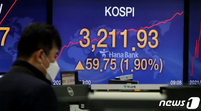 (서울=뉴스1) 임세영 기자 = 코스피가 장 초반 3,200선을 돌파한 11일 오전 서울 중구 명동 하나은행 딜링룸 전광판에 코스피 지수가 전일대비 59.75포인트(1.90%) 오른 3,211.93을 나타내고 있다. 2021.1.11/뉴스1